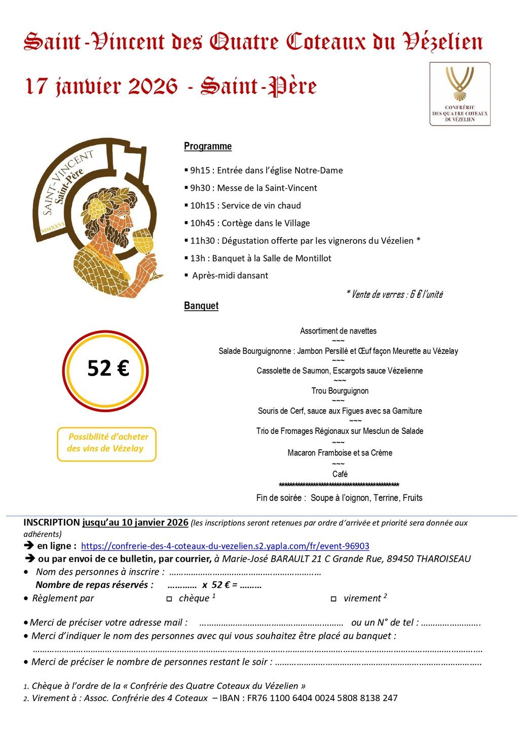 Saint-Vincent des 4 coteaux du Vézelien. 9h30 Messe dans l'église Notre-Dame à St Père, 10h15 Service du vin chaud, 10h45 Cortège dans le village, 11h30 Dégustation de vins de Vézelay* , 13h Banquet à la Salle de Montillot, après-midi dansant, et soupe à l'oignon en soirée. * vente de verres: 6€ l'unité. Inscription avant le 10 janvier 2026