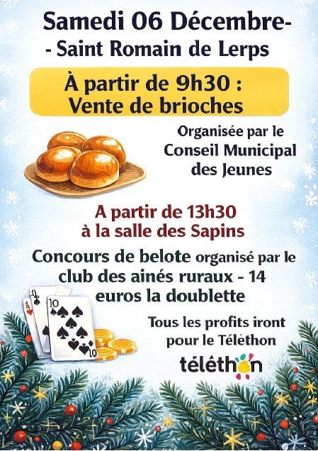 Le Conseil Municipal des Jeunes vous propose une vente de brioches samedi 6 décembre à partir de 9h30 et le Club des Ainés Ruraux enchaine avec un concours de belote à partir de 13h30 à la salle des sapins.
