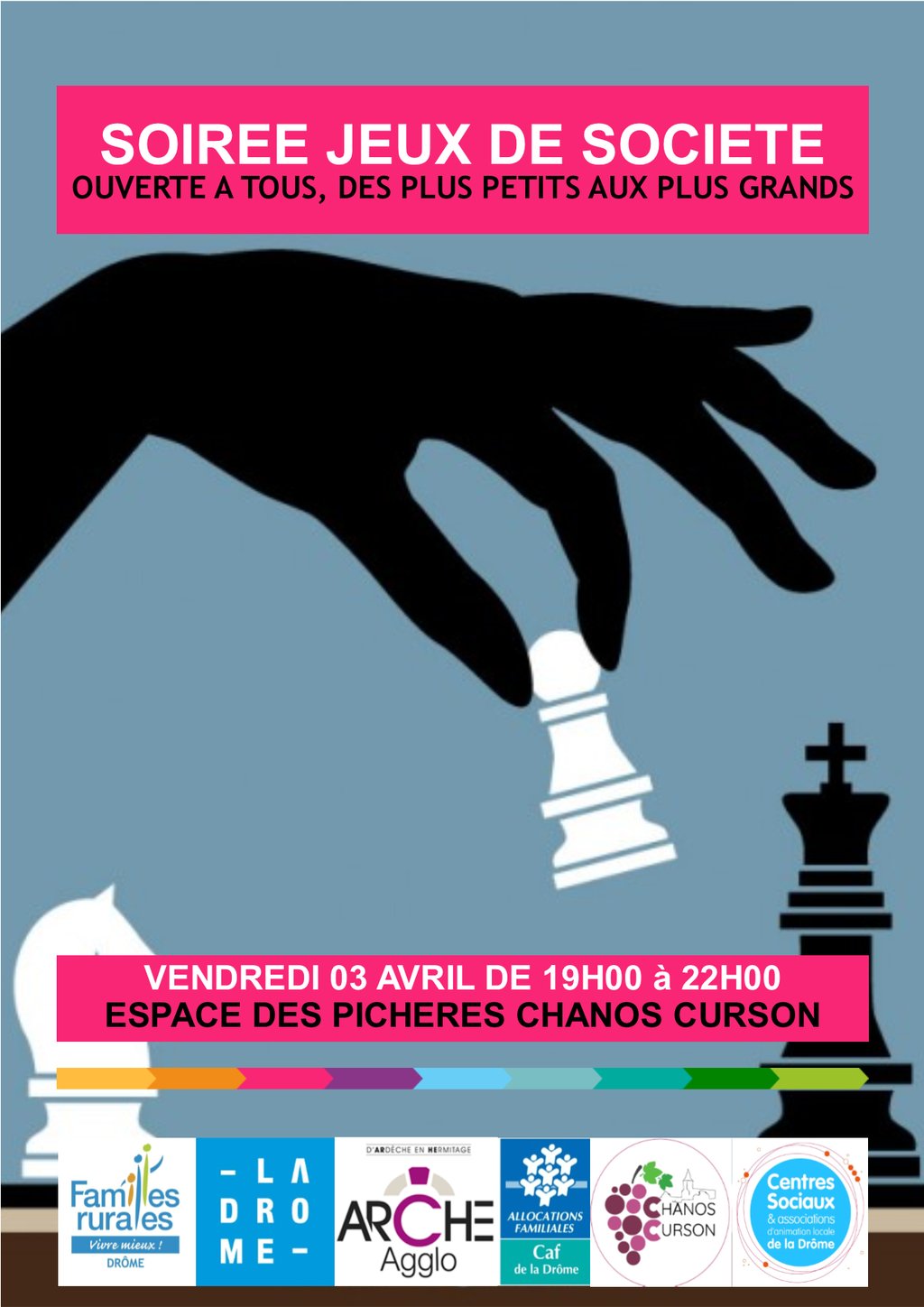 Vendredi 03 avril à partir de 19h00 nous vous proposons de venir jouer aux jeux de société à l'Espace des Pichères