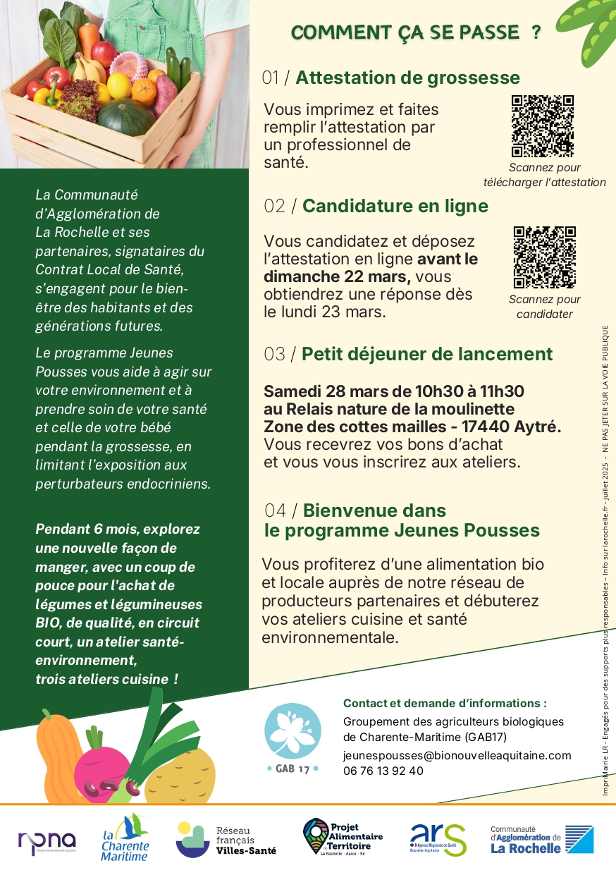 Toutes les informations et le formulaire d’inscription sont à retrouver dans notre actualité en ligne ici : https://www.agglo-larochelle.fr/-/lancement-du-programme-jeunes-pousses-avec-le-contrat-local-de-sante.