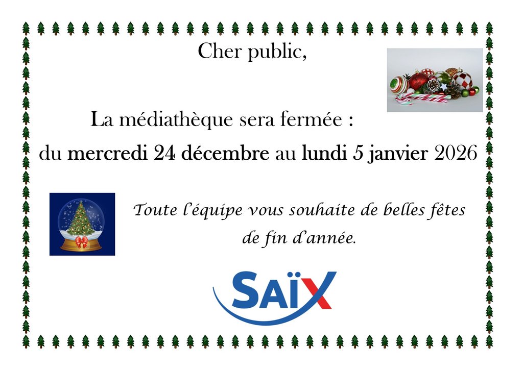 FERMETURE DE VOTRE MÉDIATHÈQUE POUR LES FÊTES