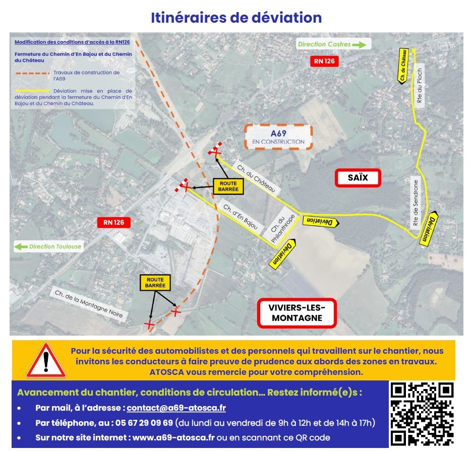 Dans le cadre des travaux de l'autoroute A69, ATOSCA réalise des travaux nécessitant la fermeture du Chemin d'en Bajou sur la commune de Saïx, à partir du 25 mars 2026 et jusqu'à début juin 2026.