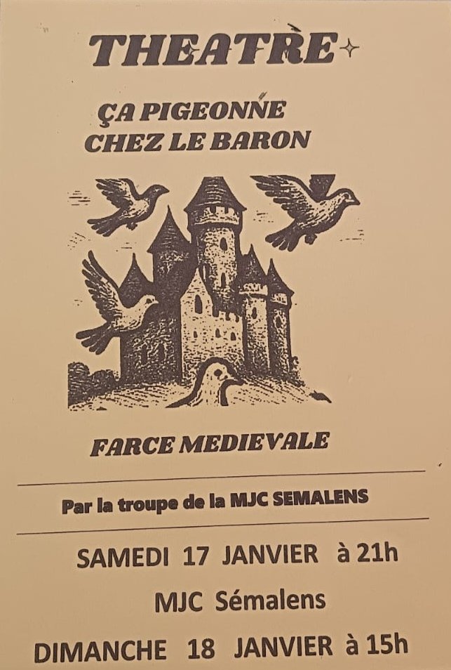 Programmation le samedi 17 janvier à 21 h et le dimanche 18 janvier 2026 à 15 h de la pièce de Théâtre "CA PIGEONNE CHEZ LE BARON" comédie en trois actes de Pascal Gérault, présentée par la troupe de la MJC de Sémalens.