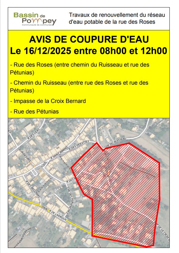 En raison des travaux de renouvellement de la conduite d’eau potable de la rue des Roses, nous vous informons d’une coupure d’eau mardi 16 décembre 2025 entre 8h00 et 12h00.