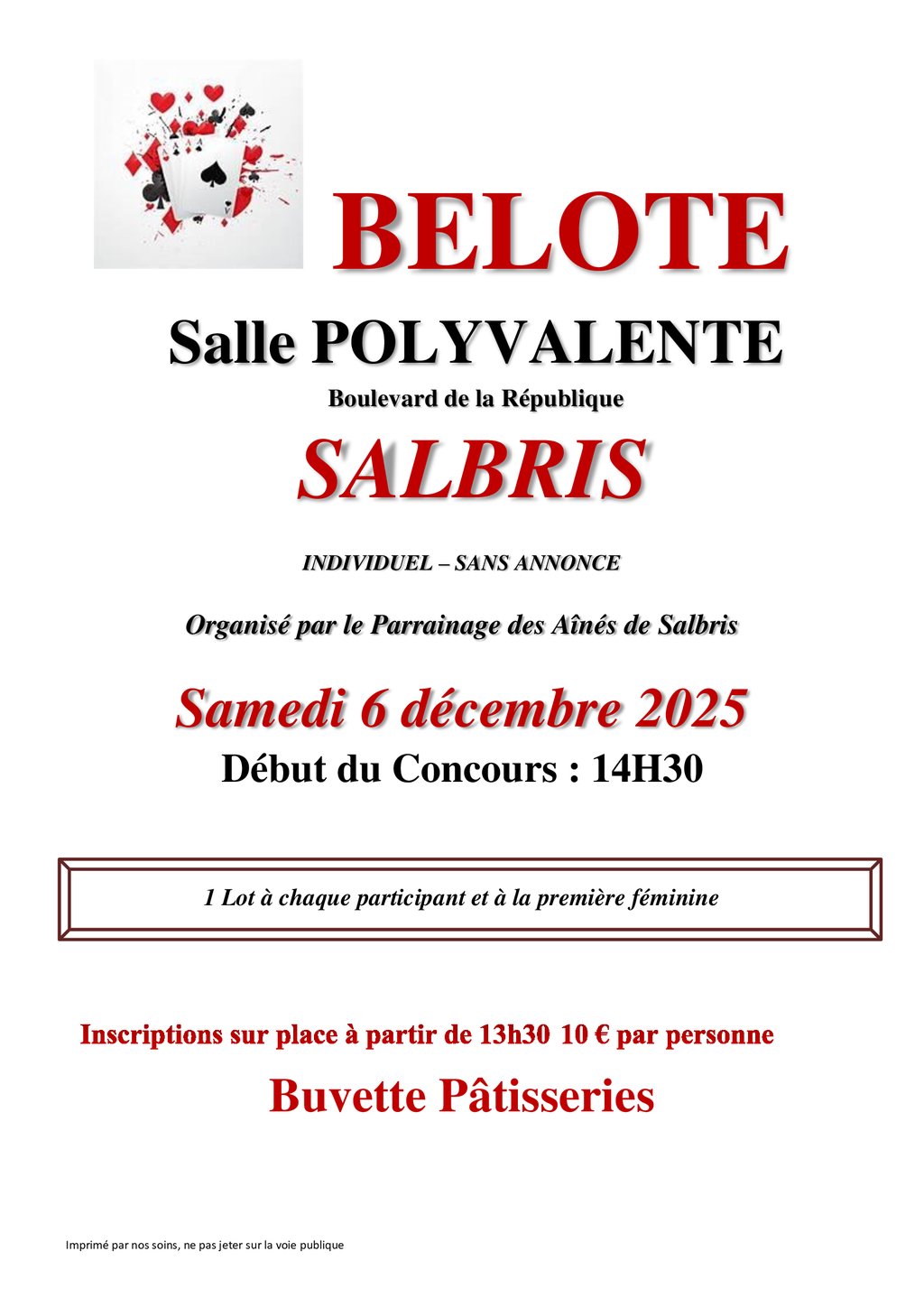 L’association du Parrainage des Aînés de Salbris organise son concours de belote, samedi 6 décembre à partir de 14h30, à la salle polyvalente de Salbris.