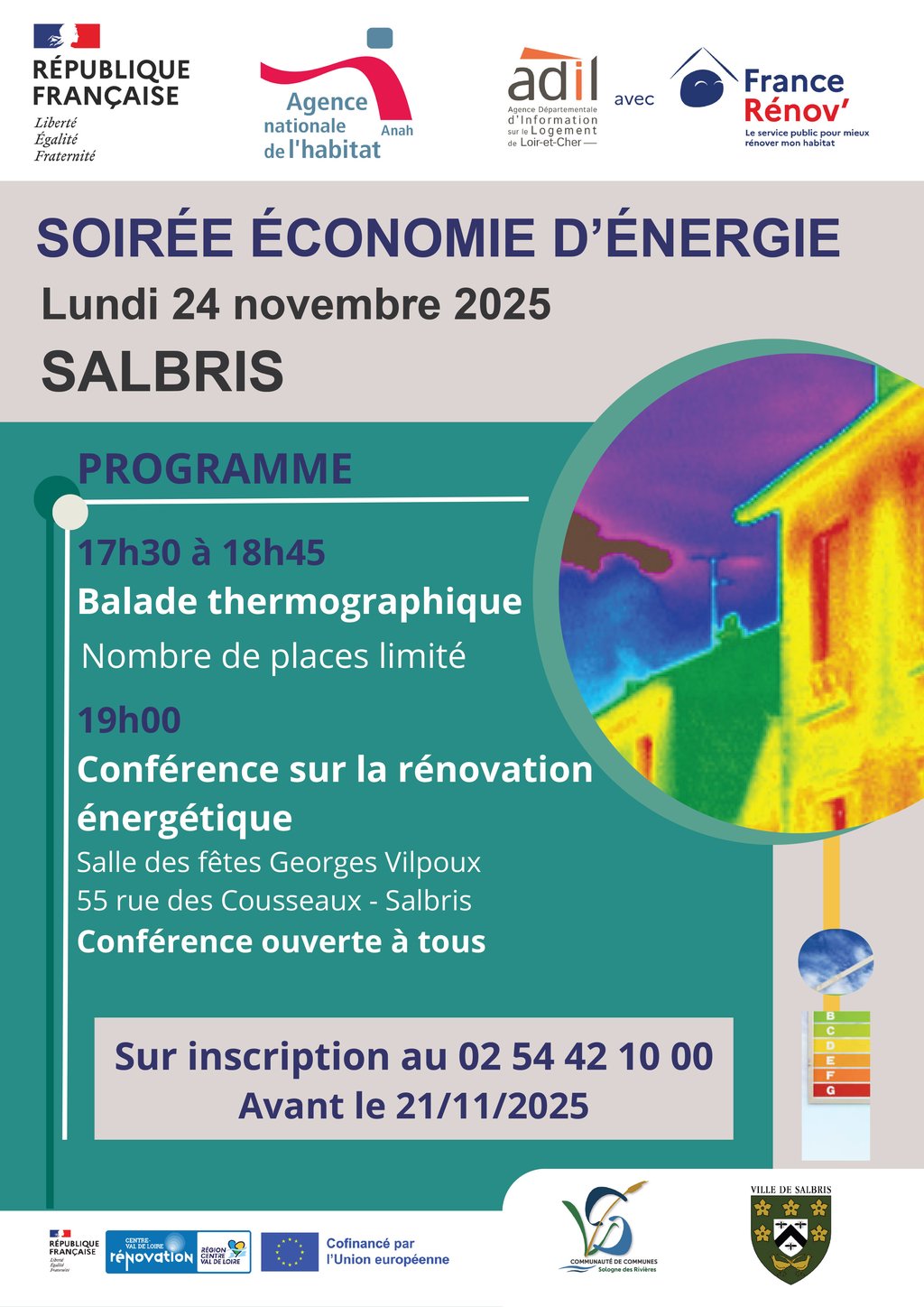 Une soirée organisée par France Rénov’, l’ADIL, l’Anah, la Communauté de communes Sologne des Rivières et la Ville de Salbris, avec le soutien de l’Union européenne 🇪🇺