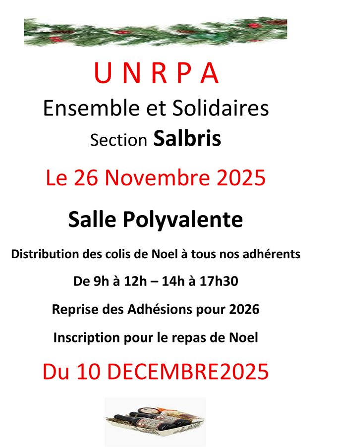 🎁 L’association UNRPA – Ensemble et Solidaires, section de Salbris, vous donne rendez-vous le mercredi 26 novembre 2025 à la salle polyvalente pour sa traditionnelle distribution des colis de Noël à l’attention de tous ses adhérents.
