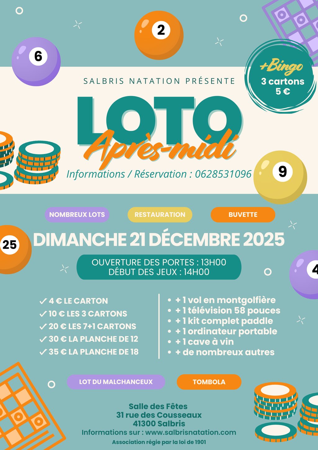 Le club de Salbris Natation vous donne rendez-vous pour son loto de fin d’année le dimanche 21 décembre 2025, à la Salle des Fêtes de Salbris.