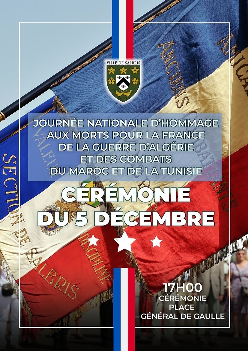Dans le cadre de la journée nationale d'hommage aux morts pour la France de la Guerre d'Algérie et des combats du Maroc et de la Tunisie, la population est invitée à la cérémonie patriotique qui se déroulera à Salbris, le vendredi 5 décembre 2025.