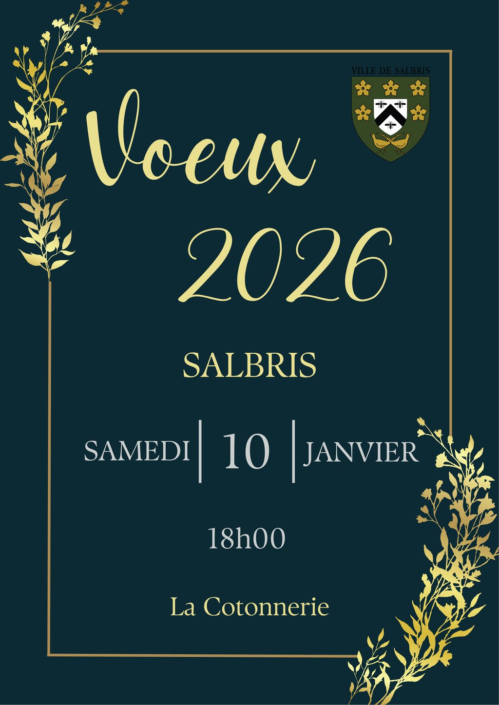 Alexandre Avril, Maire de Salbris, et le Conseil municipal de Salbris, ont le plaisir de vous convier à la cérémonie des vœux le samedi 10 janvier à 18h à la Cotonnerie de Salbris, pour échanger leurs vœux et vous présenter les projets de la Ville pour l'année.