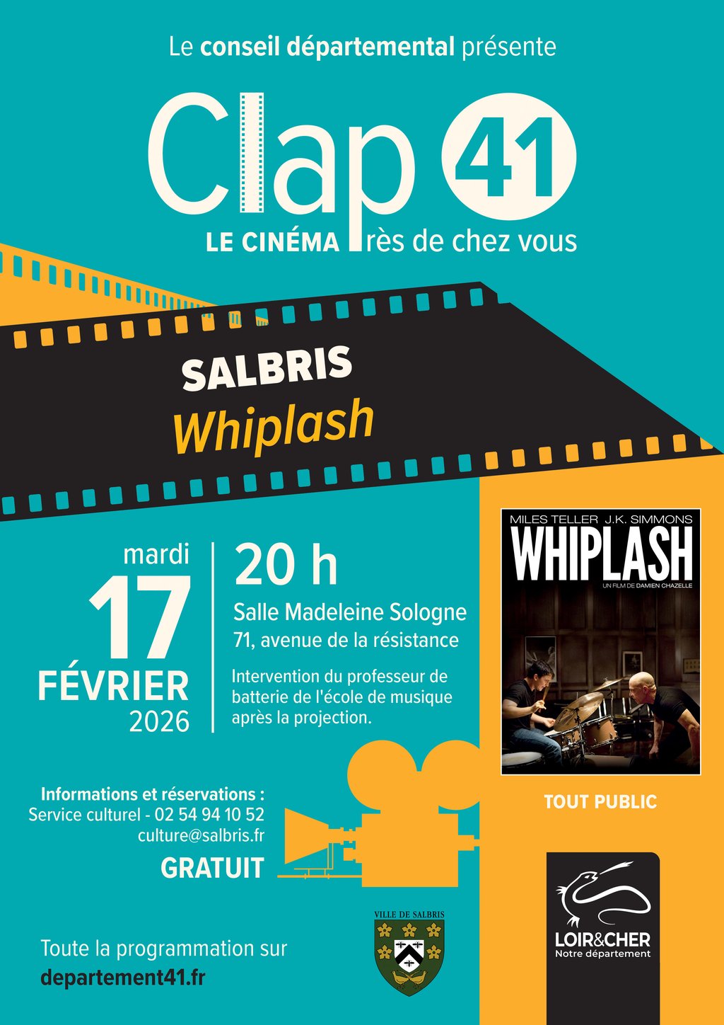 Dans le cadre du dispositif départemental Clap 41 – le cinéma près de chez vous, la Ville de Salbris propose une projection gratuite du film Whiplash, le mardi 17 février 2026 à 20h, à la Salle Madeleine Sologne.