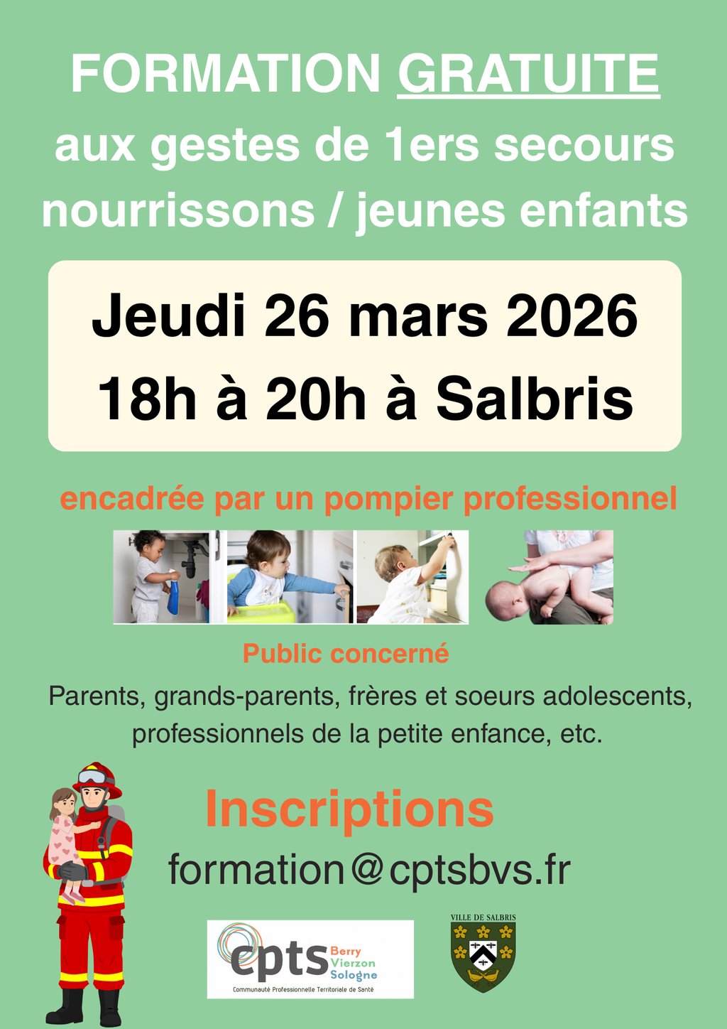 La Ville de Salbris, en partenariat avec la CPTS Berry Vierzon Sologne, organise une formation gratuite consacrée aux gestes de premiers secours appliqués aux nourrissons et jeunes enfants.