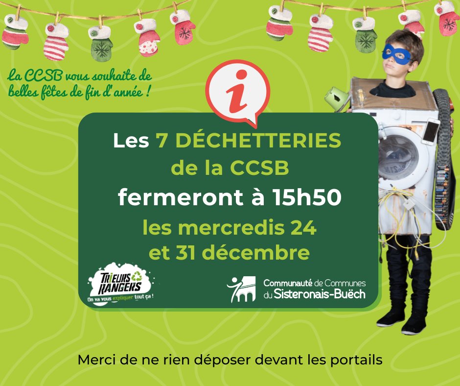 ℹ️ Exceptionnellement, les 7 déchetteries du territoire fermeront à 15h50 les mercredis 24 et 31 décembre.