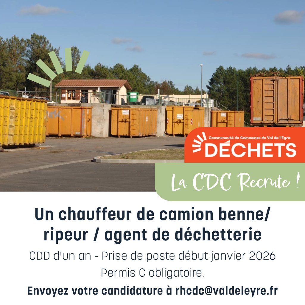 OFFRE D'EMPLOI : CHAUFFEUR DE CAMION BENNE, RIPEUR ET AGENT DE DÉCHETTERIE