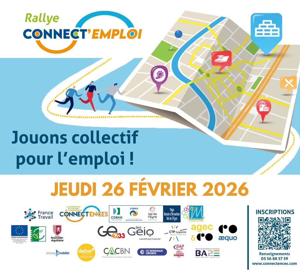 La plateforme Connect’ences du Pays Bassin d’Arcachon-Val de l’Eyre (COBAS, COBAN et la CDC du Val de l’Eyre), en partenariat avec France Travail et la Mission Locale du Bassin d’Arcachon et du Val de l’Eyre, organise la 6ᵉ édition du Rallye Connect’Emploi sur le territoire.