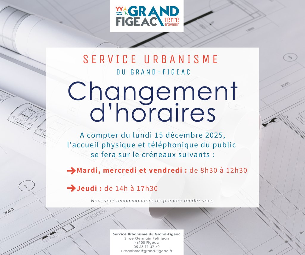 A compter du 15 décembre 2025, le service urbanisme du Grand-Figeac accueillera le public, physiquement et par téléphone comme suit :