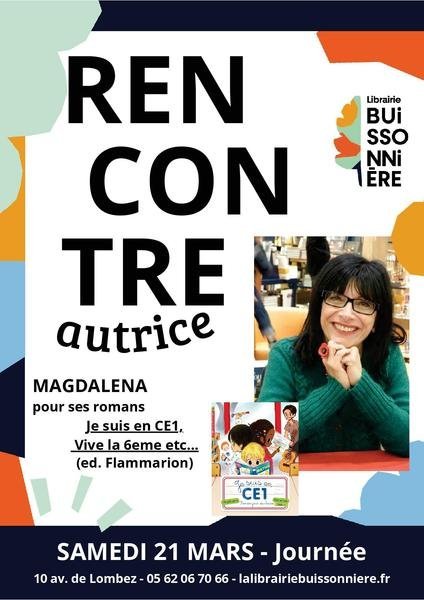 Rencontre à 15h, avec Magdalena Guirao, autrice et illustratrice de la collection des Je suis en CP, Je suis CE1...suivi d'un goûter à la librairie buissonnière à Samatan