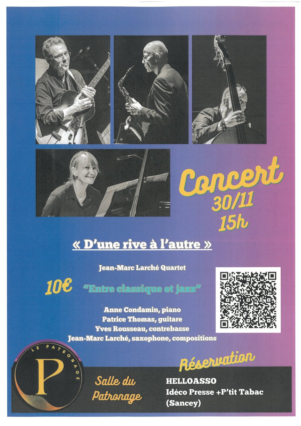 « D’UNE RIVE À L’AUTRE » Le quartet de Jean-Marc Larché, dont les membres sont issus d’horizons musicaux très différents, propose une musique qui s’abreuve aux sources du jazz et de la tradition classique, et dans laquelle improvisation et écriture alternent constamment avec une vivacité toujours empreinte de poésie. Gustav Mahler, Béla Bartók, György Ligeti y font de discrètes apparitions, de même que quelques personnages hauts en couleurs tels que Casanova, Barbe Bleue…