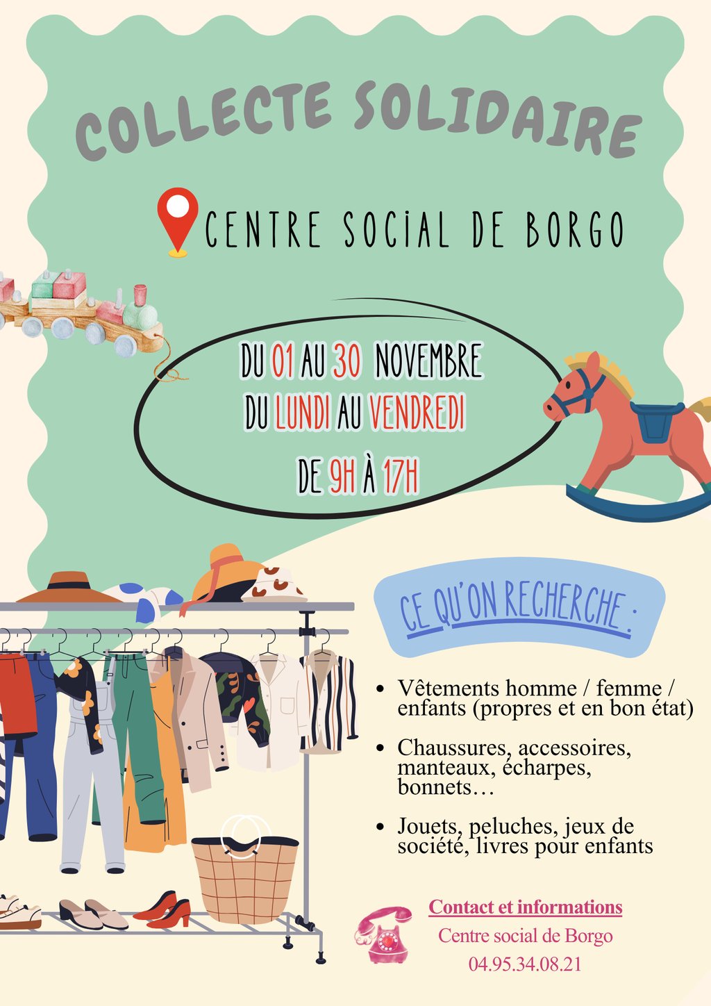 Le Centre Social de Borgo vous invite durant le mois de Novembre à une collecte solidaire de vêtements femmes, enfants, hommes, mais aussi accessoires, jouets et livres. Bien entendu, les dons doivent être en bon état et propre.