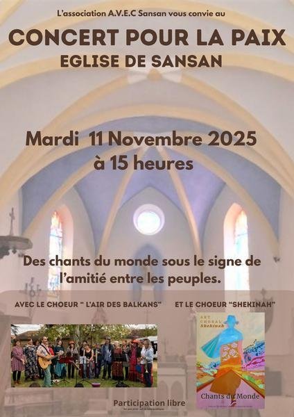 Les ensembles "Shekinah" et la chorale de "L'Air des Balkans" nous feront la joie de venir nous interpréter des chants du monde à l' occasion du 11 novembre.