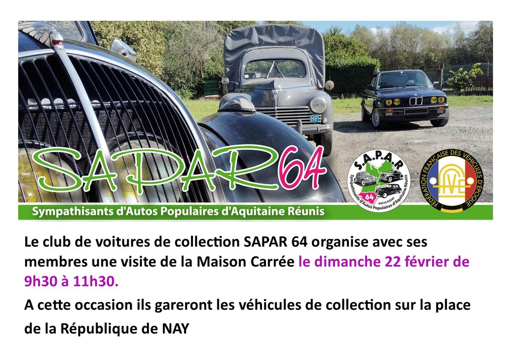 Le club de voitures de collection SAPAR 64 organise avec ses membres une visite de la Maison Carrée le dimanche 22 février de 9h30 à 11h30. A cette occasion ils gareront les véhicules de collection sur la place de la République de NAY