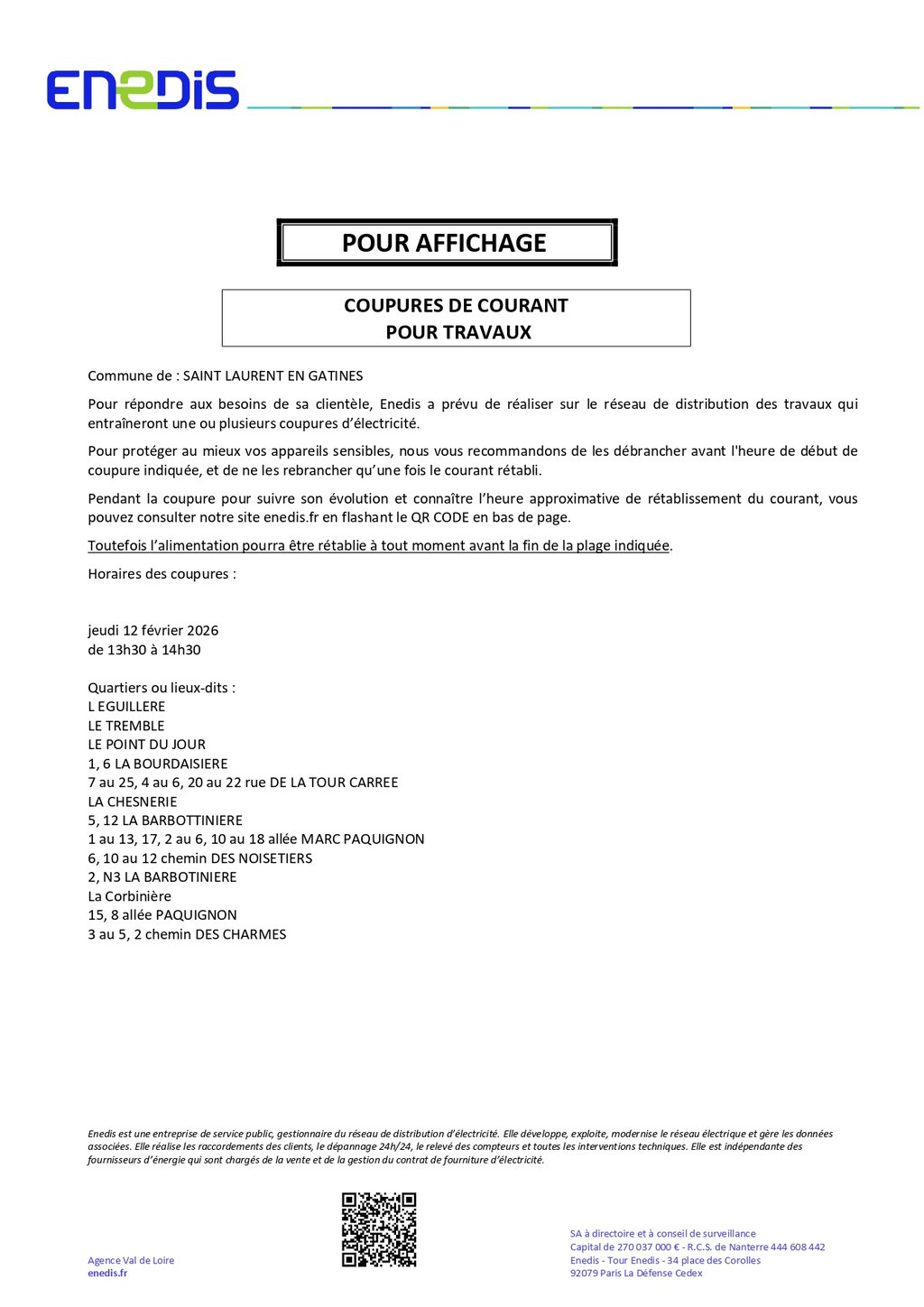 La commune informe les habitants qu’une coupure d’électricité est programmée le jeudi 12 février 2026, afin de permettre des travaux sur le réseau électrique.
