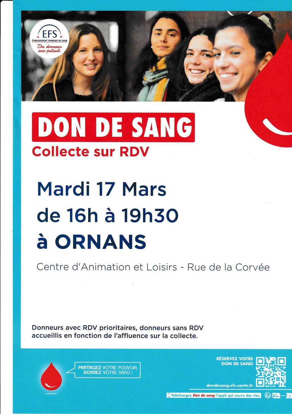 L'association des donneurs de sang du pays d'Ornans organise une collecte de sang le mardi 17 mars 2026 de 16h à 19h30.