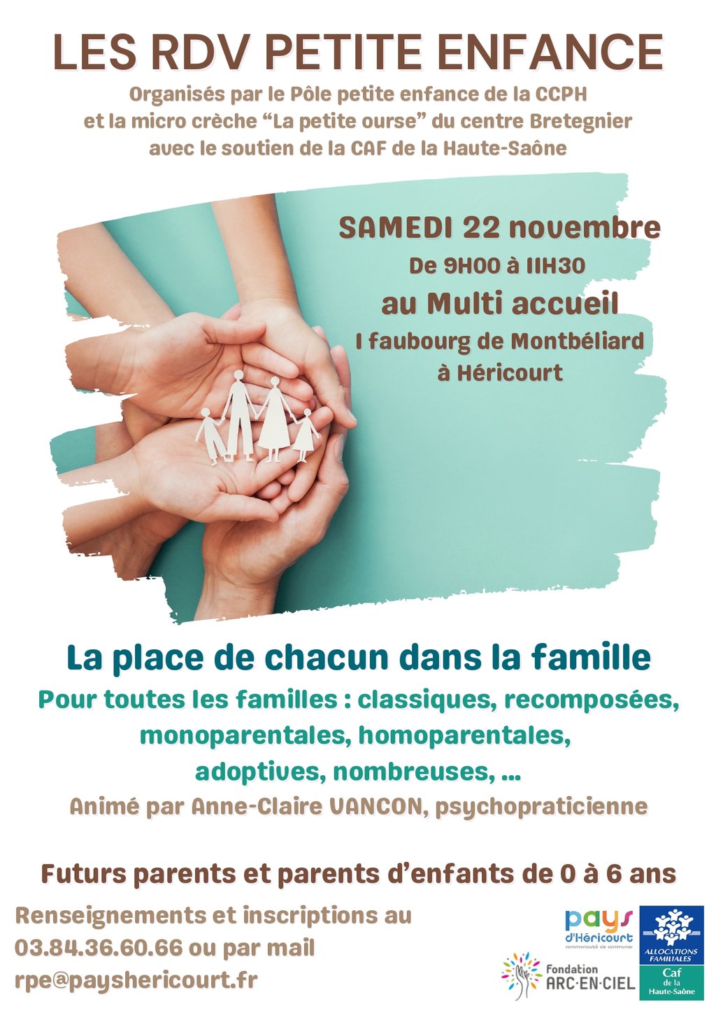Le Pôle Petite Enfance de la CCPH et la micro crèche "La petite ourse" du Centre Bretegnier d'Héricourt, avec le soutien de la CAF de la Haute-Saône organisent un prochain rendez-vous Petite Enfance sur le thème de la place de chacun dans la famille le :