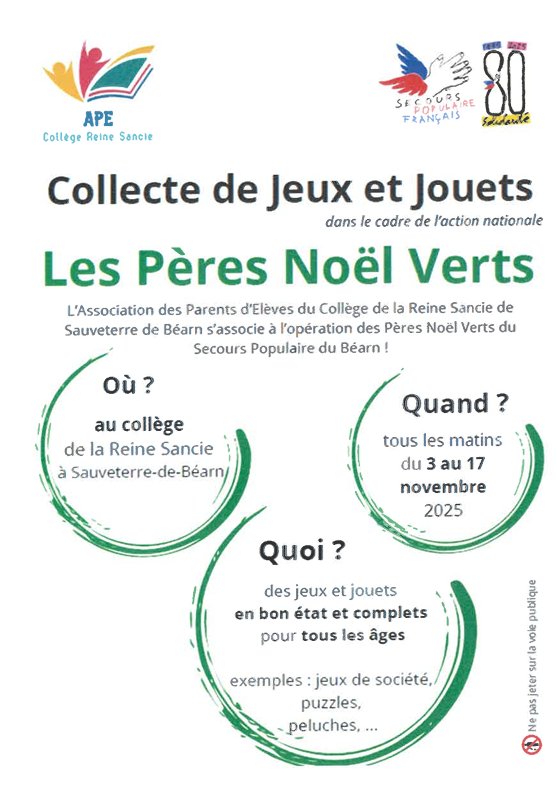 L'association des Parents d'élève du Collège de la Reine Sancie organise une collecte de jeux et de jouets en partenariat avec le Secours Populaire