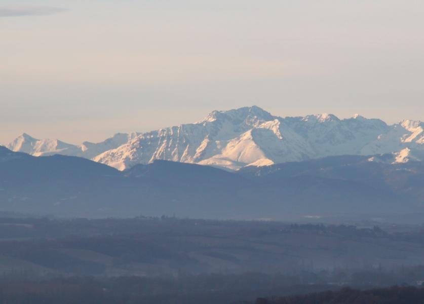 Cette vue commence sur les vallées la Save et de la Gesse puis se prolonge du Mont Canigou au Pic d'Anie.