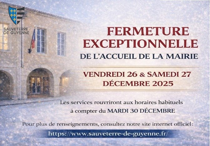 L’accueil de la Mairie de Sauveterre-de-Guyenne sera exceptionnellement fermé le vendredi 26 et le samedi 27 décembre 2025.