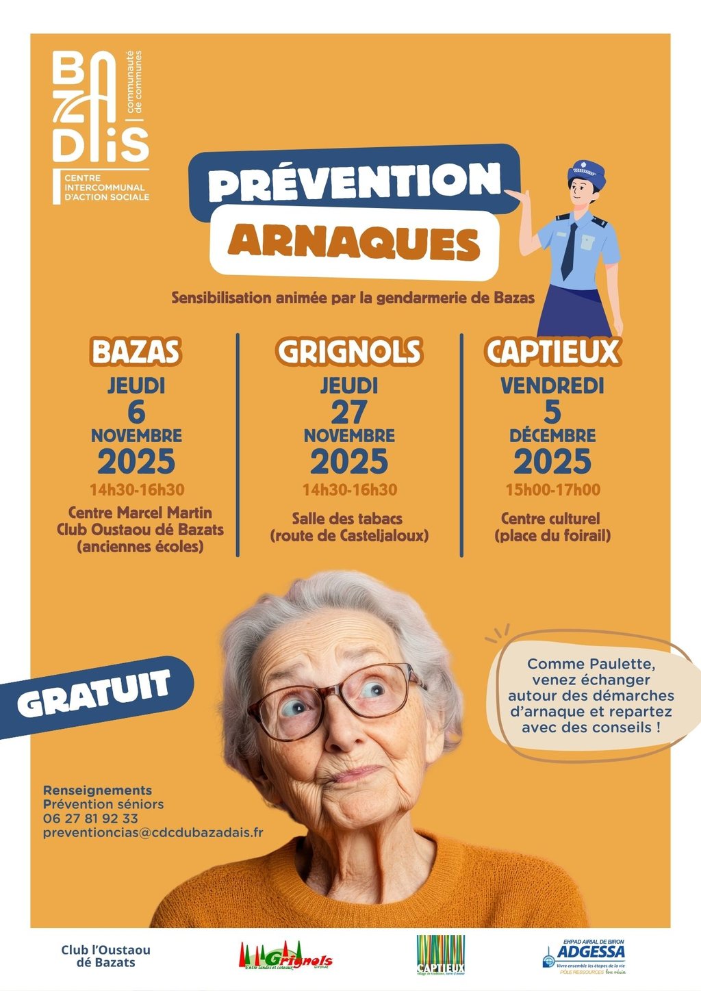 Dans le cadre de ses actions de prévention, le Centre Intercommunal d’Action Sociale du Bazadais, en partenariat avec la gendarmerie de Bazas et ses partenaires locaux, organise trois réunions d’information dédiées à la sécurité des séniors.