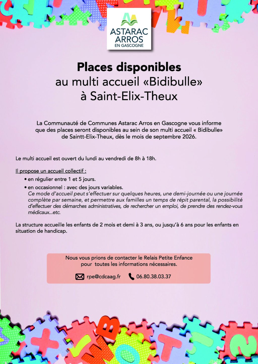 PLACES DISPONIBLES AU MULTI ACCUEIL BIDIBULLE