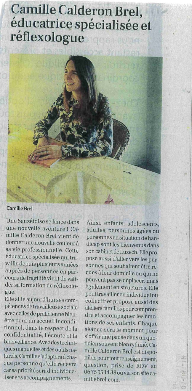 Bienvenue à 𝐂𝐚𝐦𝐢𝐥𝐥𝐞 𝐁𝐑𝐄𝐋 𝐂𝐀𝐋𝐃𝐄𝐑𝐎𝐍, Camille naturo.reflexo qui propose désormais à domicile / en entreprise, des séances de réflexologie ainsi que des techniques naturopathiques dans un but d’accompagnement au bien-être, auprès d'enfants, adolescents, adultes ou personnes âgées, en situation de handicap ou non.