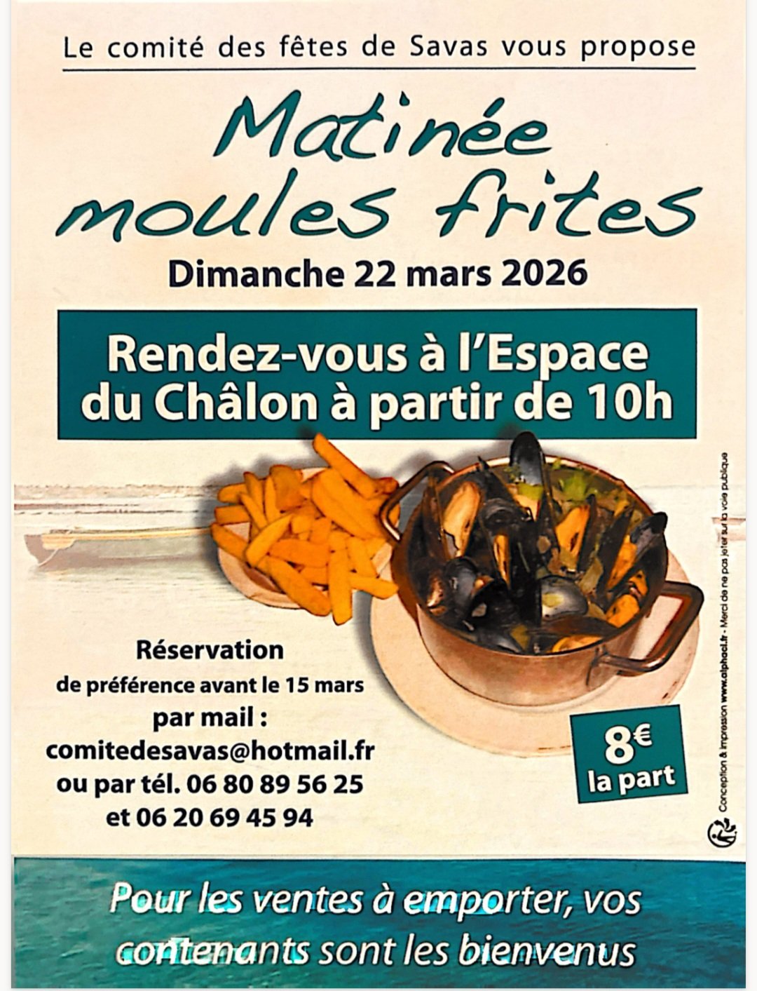 Venez nous rejoindre à la matinée moules-frites organisée par le comité des fêtes à l'espace du Chalon à Savas