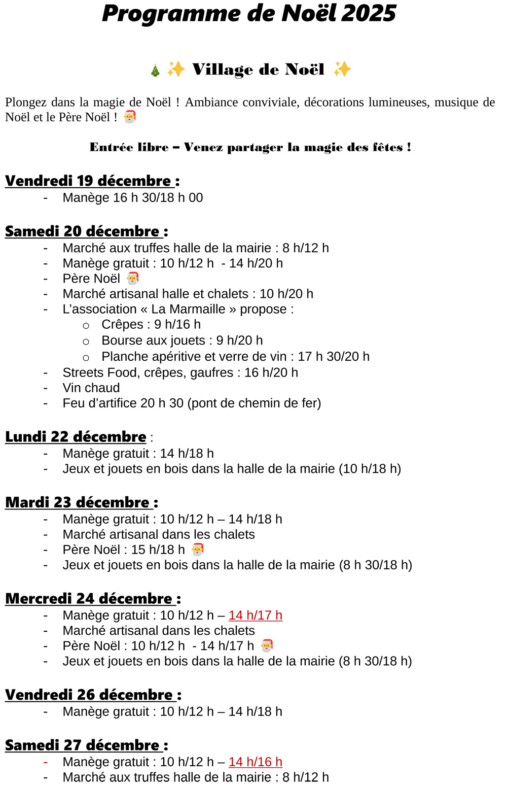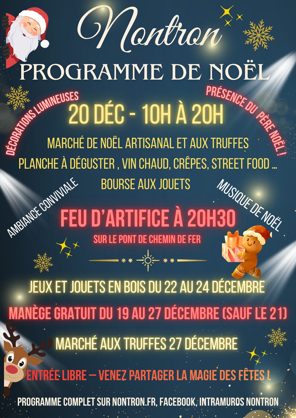 NONTRON : Village de Noël : Plongez dans la magie de Noël ! ambiance conviviale, décorations lumineuses, musique de Noël et présence du Père Noël !, manège gratuit, jeux, marché artisanal, marché aux truffes, ... et feu d'artifice ! Consultez le programme des animations du vendredi 19 décembre au samedi 27 décembre 2025.