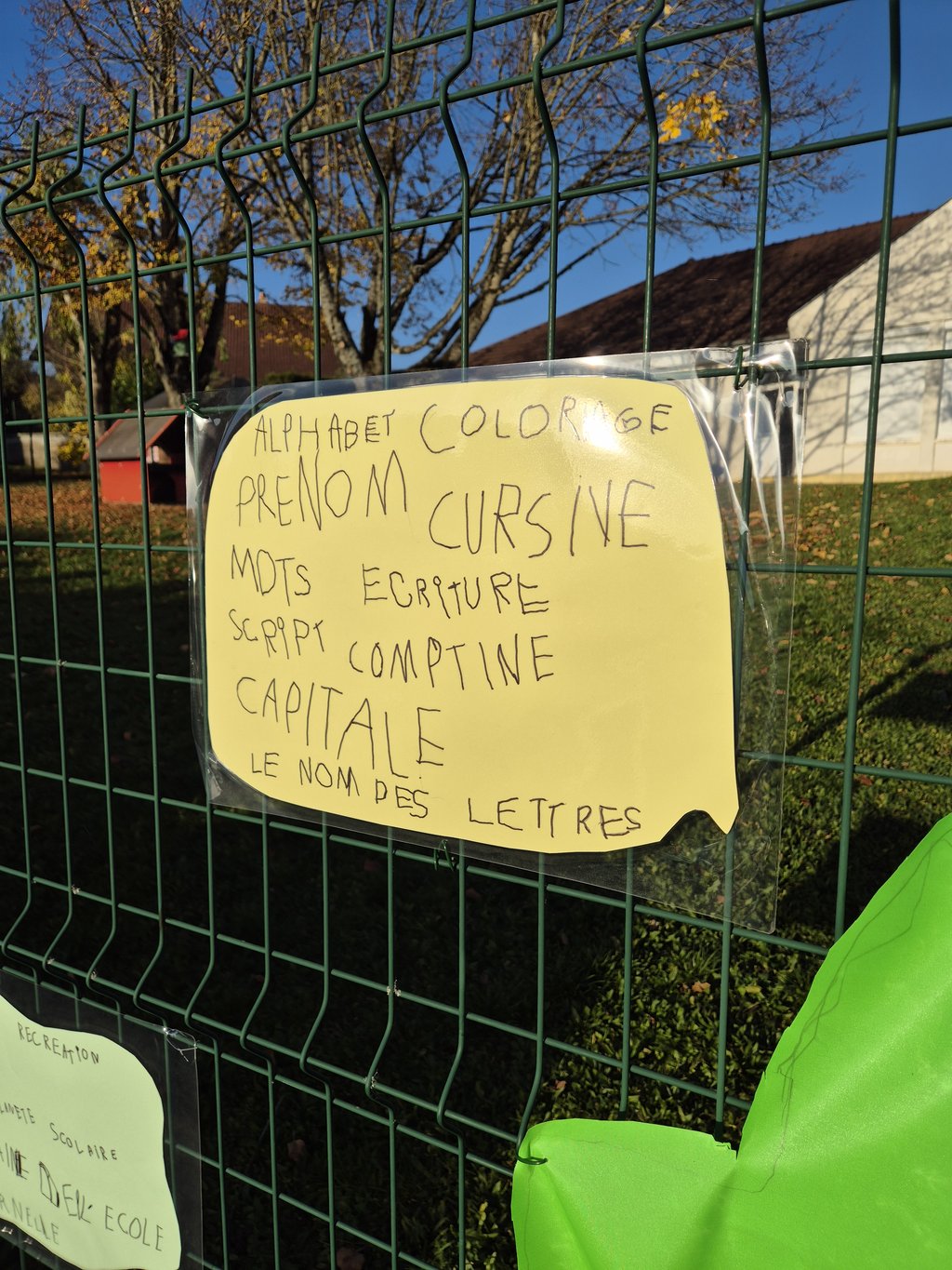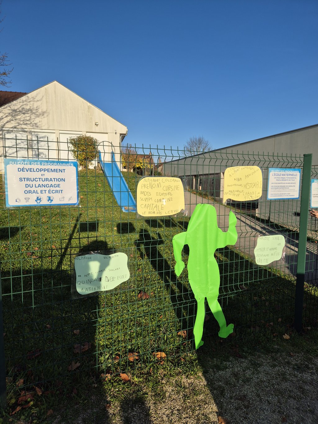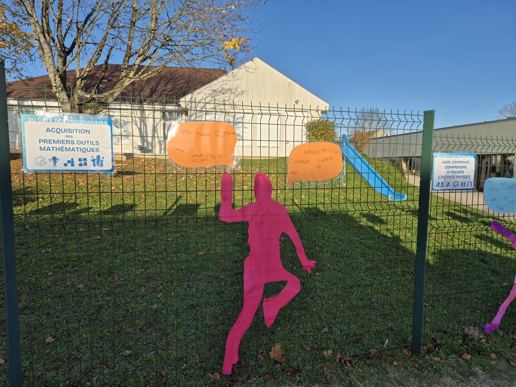 Les enfants ont réalisé une exposition sur les grilles de l'école côté Clos de la Mare "Notre école maternelle en mots". Ils ont réalisé les silhouettes d'enfants de la classe et écrit les mots qu'ils utilisent à l'école dans des bulles. Ceux-ci ont été regroupés par domaine d'apprentissage.