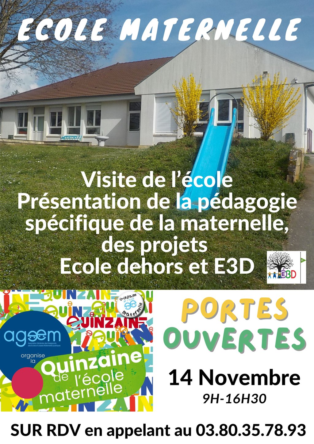 Dans le cadre de la Quinzaine de l’École Maternelle, initiée par l'AGEEM, pour valoriser la pédagogie de l’école maternelle, vous pouvez venir échanger avec la directrice de l'école lors des portes ouvertes du vendredi 14 novembre.