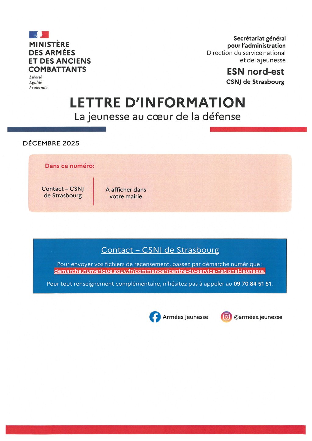 LETTRE D'INFORMATION : LA JEUNESSE AU COEUR DE LA DÉFENSE