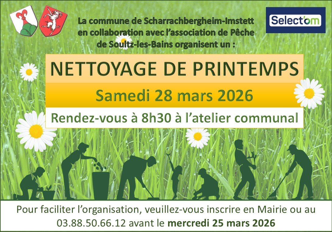 La commune de Scharrachbergheim-Irmstett en collaboration avec l'association de Pêche de Soultz-les-Bains organisent un nettoyage de printemps le samedi 28 mars 2026. Rendez-vous à 8h30 à l'atelier communal !