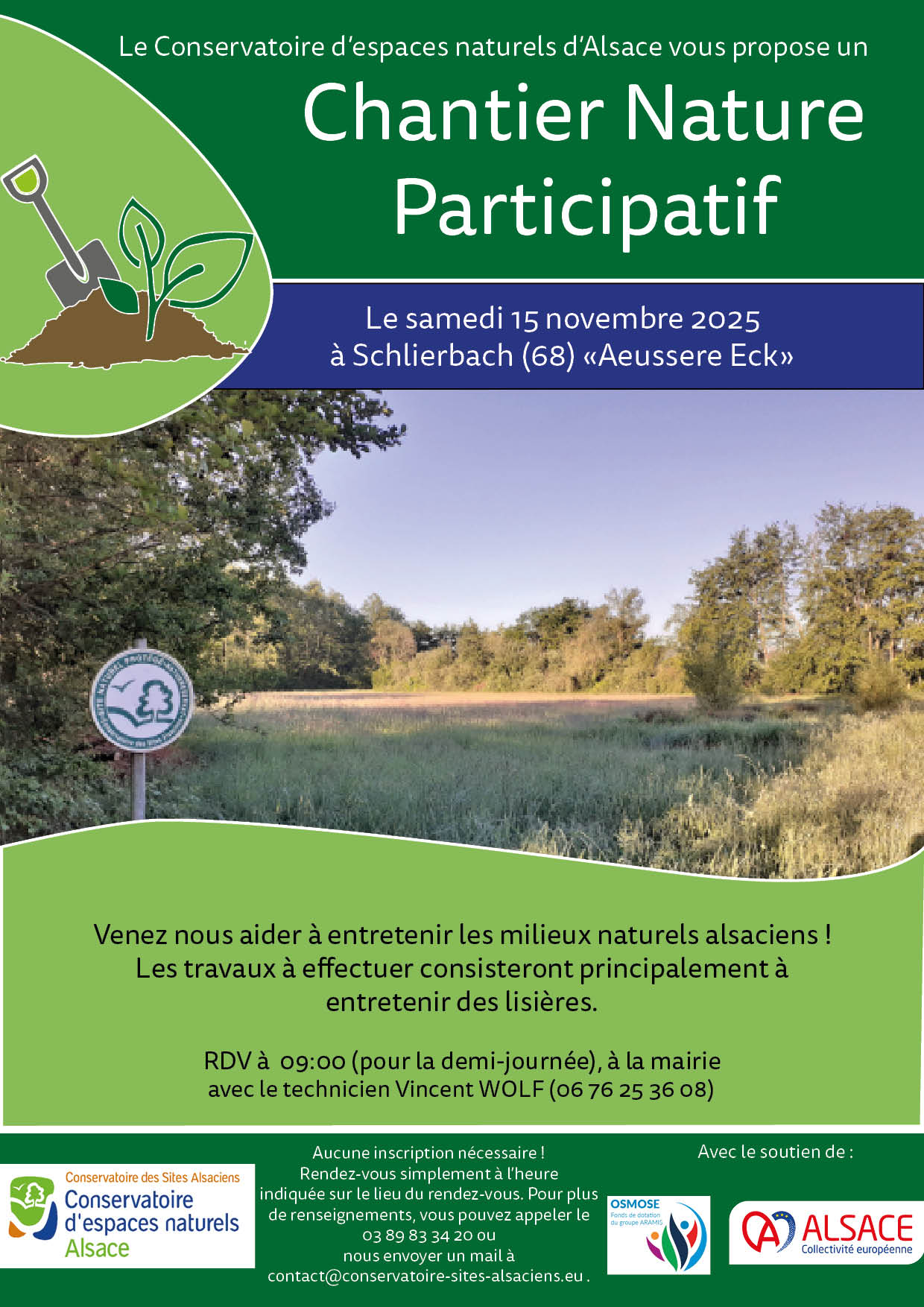 Chantier participatif d'entretien du Petit Ried (lieu dit Aeussere Eck) à SCHLIERBACH, site géré par le Conservatoire d’espaces naturels d’Alsace - Samedi 15 novembre - de 9h à 12h - Rendez-vous devant la mairie de Schlierbach.
