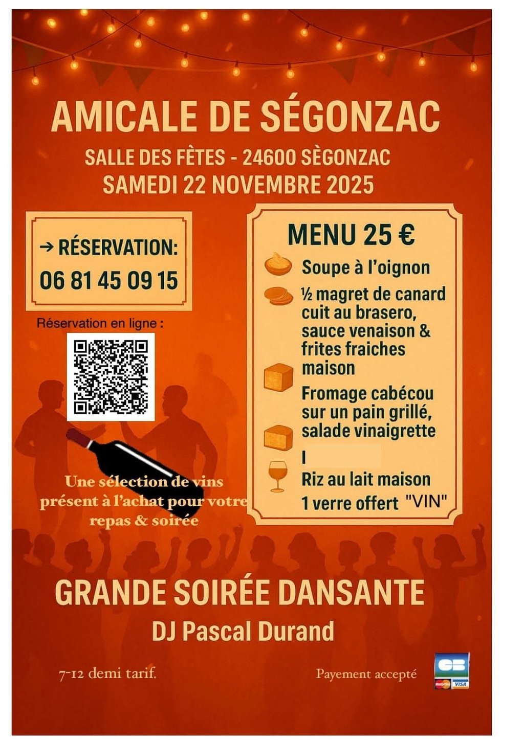 L'amicale de Segonzac organise le samedi 22 novembre à 19 h 30 à la salle des fêtes une grande soirée dansante, animée par Pascal Durand.