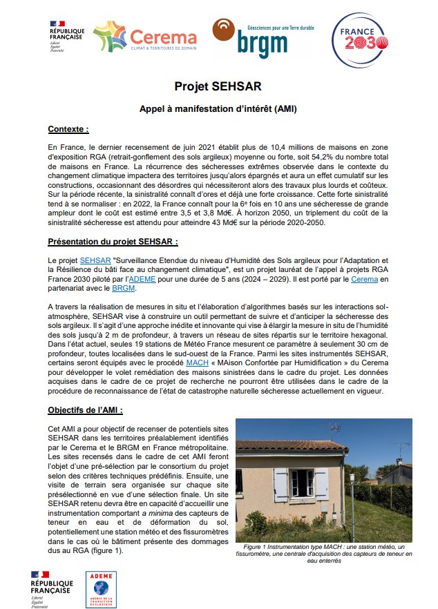 Le projet SEHSAR "Surveillance Etendue du niveau d’Humidité des Sols argileux pour l’Adaptation et la Résilience du bâti face au changement climatique" est un projet lauréat de l’appel à projets RGA France 2030 piloté par l’ADEME pour une durée de 5 ans (2024– 2029). Il est porté par le Cerema en partenariat avec le BRGM. À travers la réalisation de mesures in situ et l’élaboration d’algorithmes basés sur les interactions sol et atmosphère, SEHSAR vise à construire un outil permettant de suivre et d’anticiper la sécheresse des sols argileux. Il s’agit d’une approche inédite et innovante qui vise à élargir la mesure in situ de l’humidité des sols jusqu’à 2 m de profondeur, à travers un réseau de sites répartis sur le territoire hexagonal. Dans l’état actuel, seules 19 stations de Météo France mesurent ce paramètre à seulement 30 cm de profondeur, toutes localisées dans le sud-ouest de la France. Parmi les sites instrumentés SEHSAR, certains seront équipés avec le procédé MACH « Maison Confortée par Humidification » du Cerema pour développer le volet remédiation des maisons sinistrées dans le cadre du projet. Les données acquises dans le cadre de ce projet de recherche ne pourront être utilisées dans le cadre de la procédure de reconnaissance de l’état de catastrophe naturelle sécheresse actuellement en vigueur.