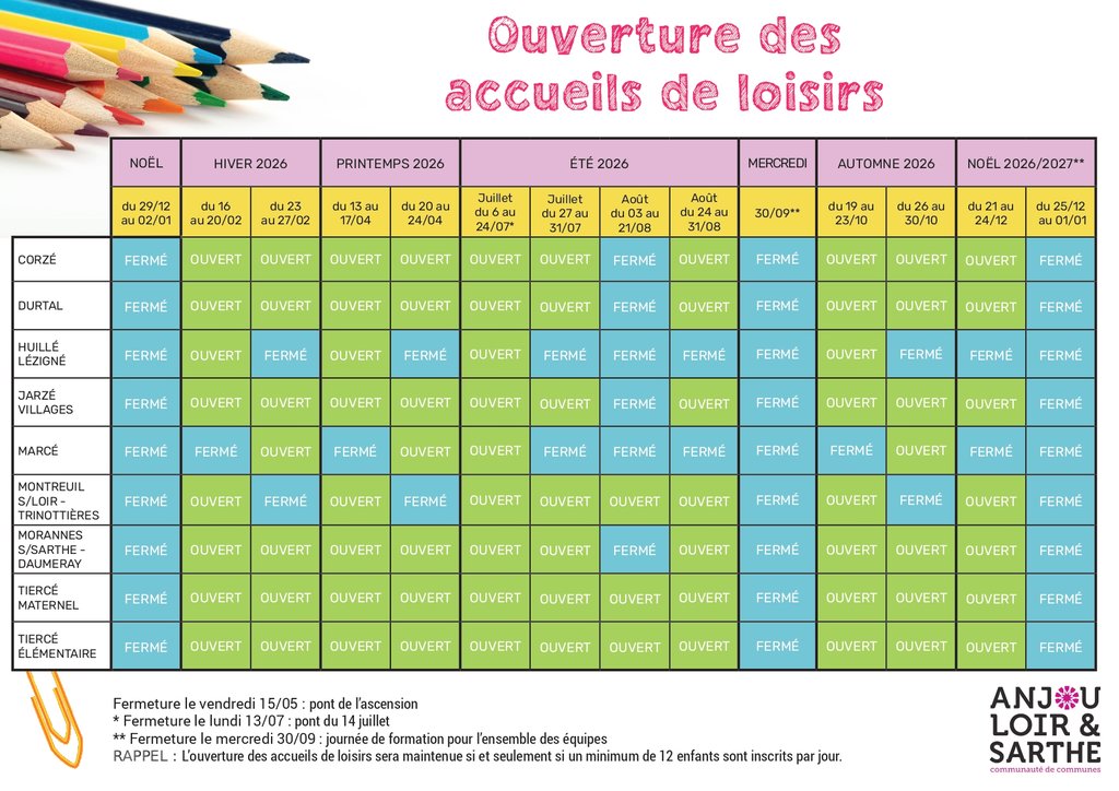 Veuillez trouver ci-joint les ouvertures et fermetures des accueils de loisirs de la CCALS pour 2026.