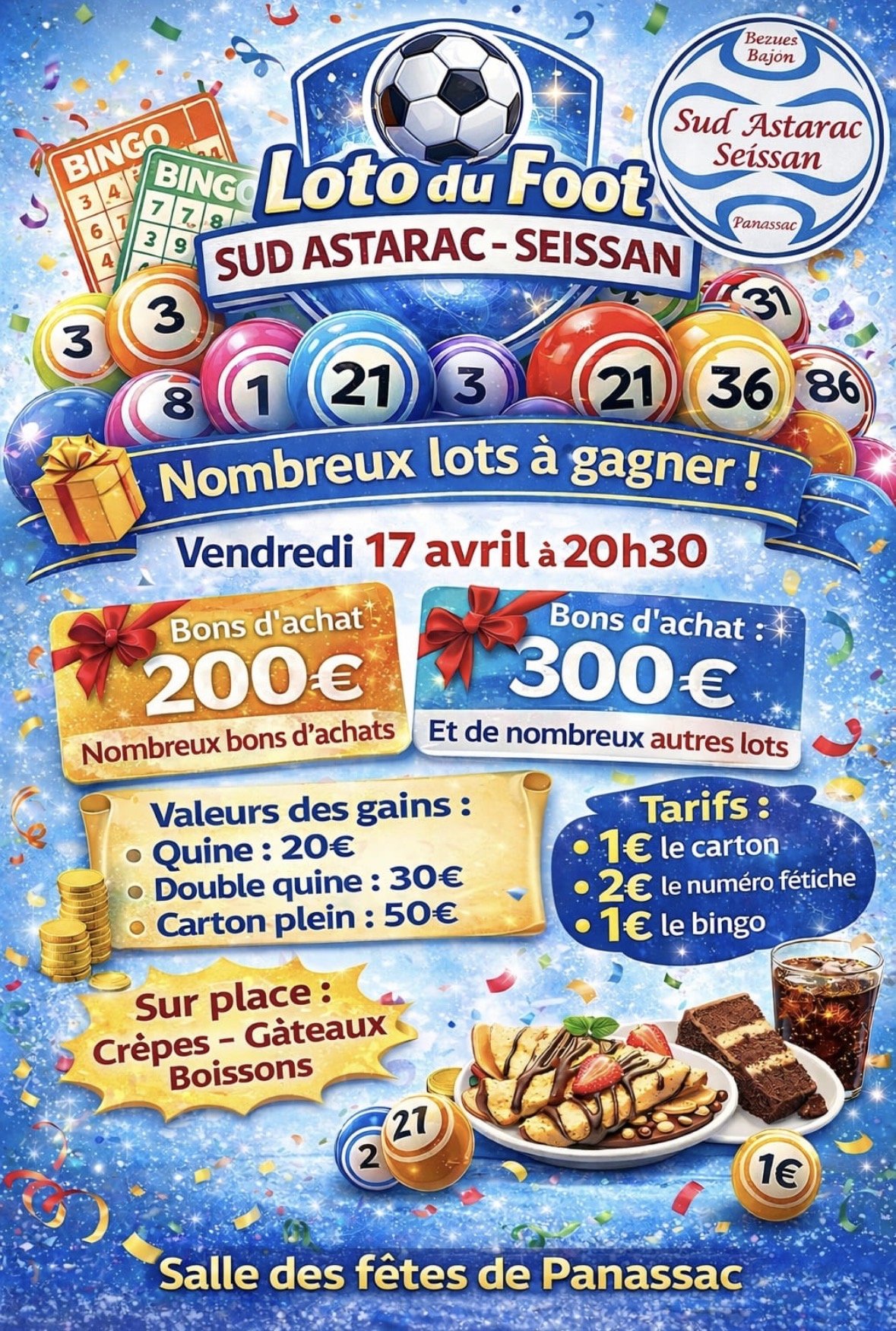 Le 2ème loto du club Sud-Astarac Seissan aura lieu à Panassac le vendredi 17 Avril à 20H30