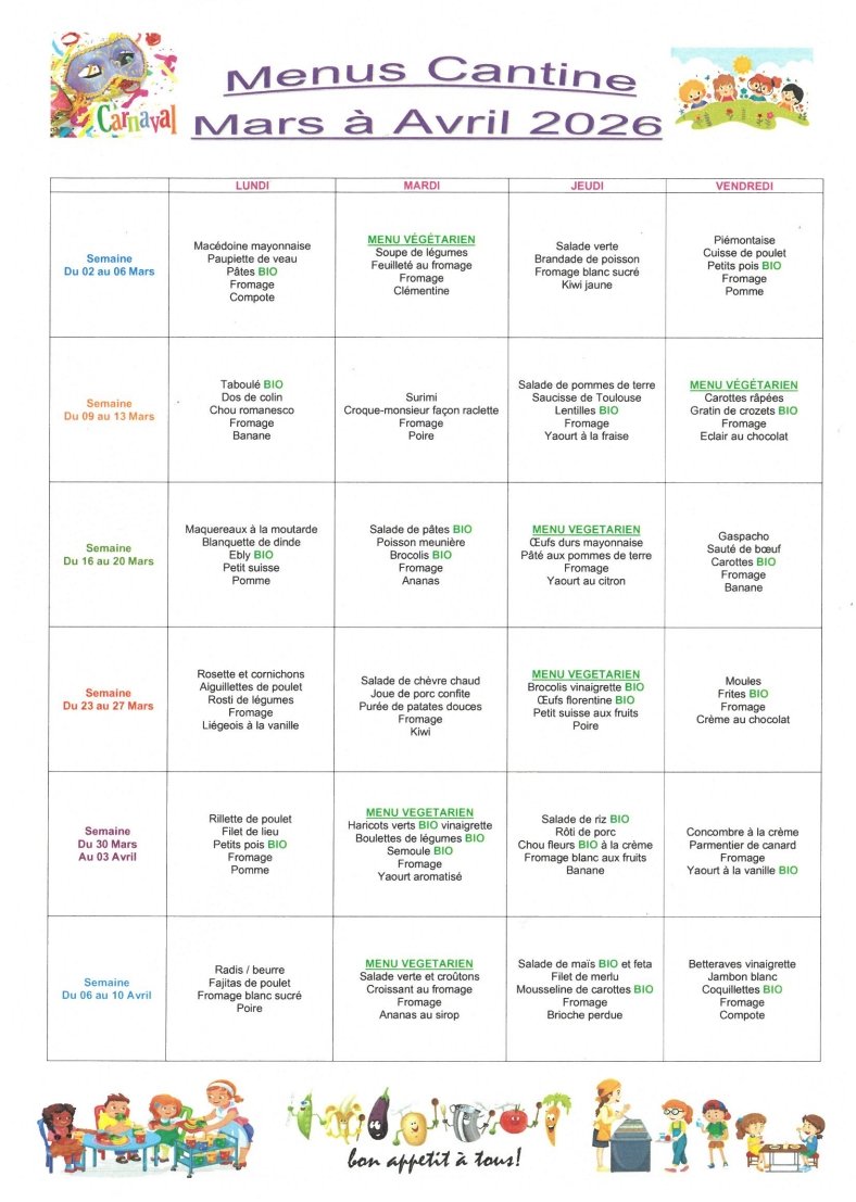 MENU CANTINE MARS ET AVRIL 2026