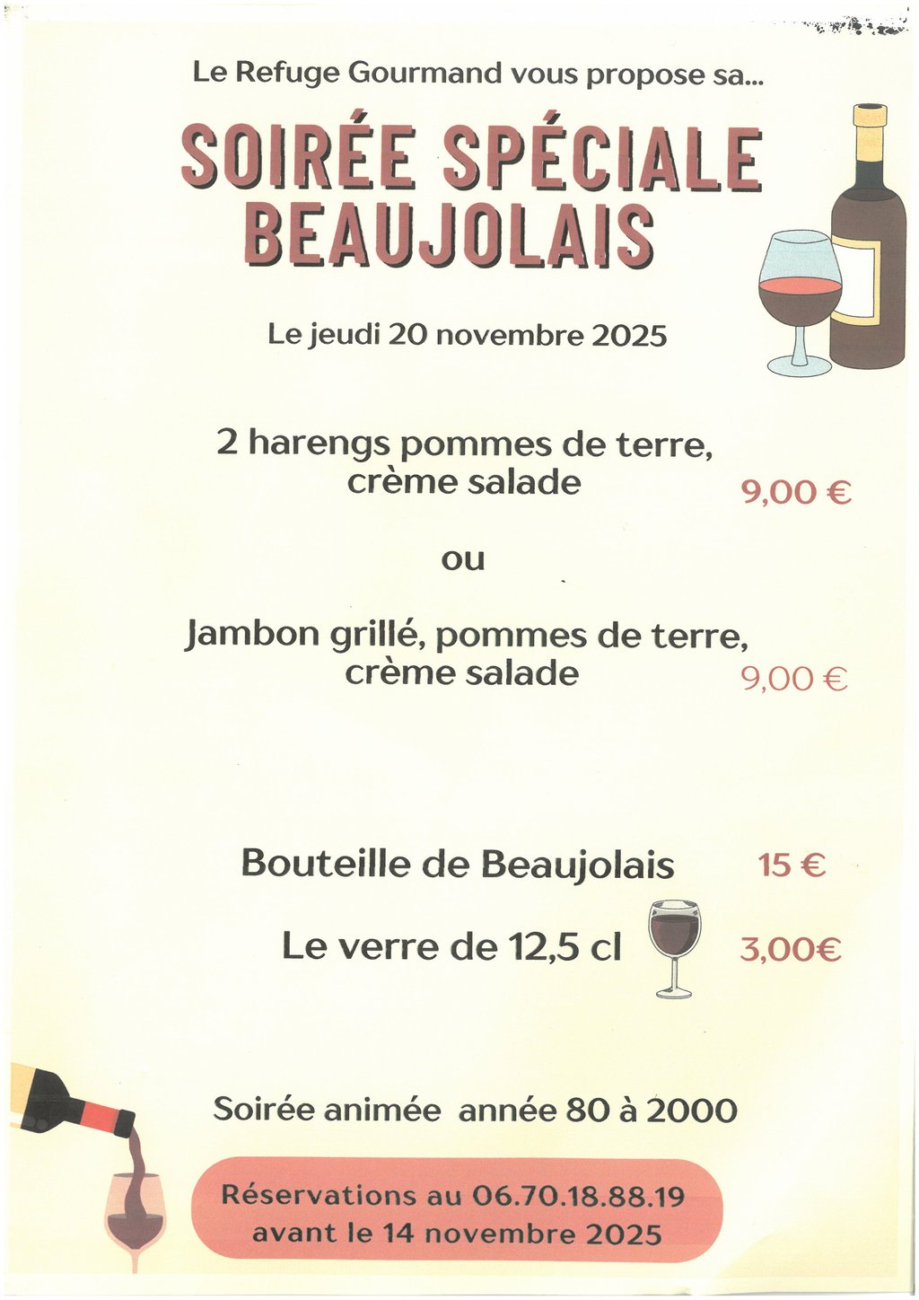 Soirée spéciale Beaujolais le jeudi 20 Novembre 2025 Au Refuge Gourmand
