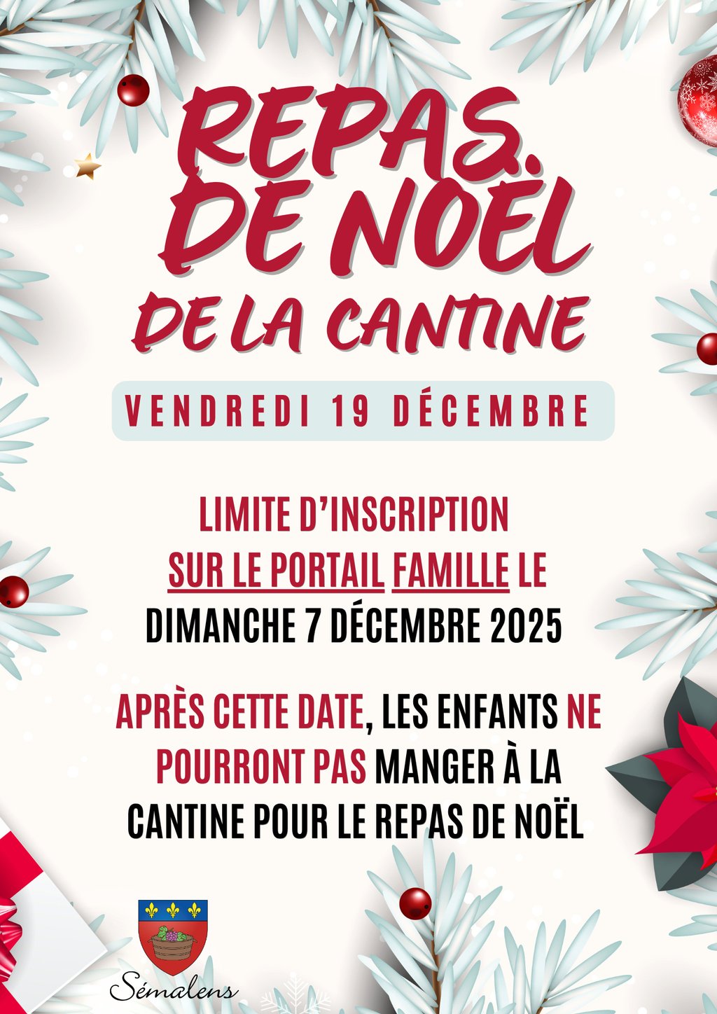 La limite d'inscription pour le repas de Noël sur le portail famille est au dimanche 7 décembre 2025.