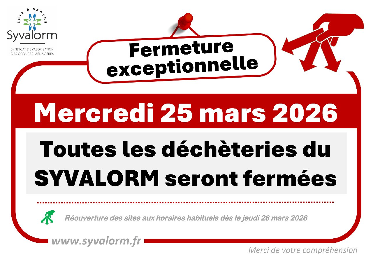 Nous vous informons de la fermeture exceptionnelle de toutes les déchèteries SYVALORM le mercredi 25 mars 2026.