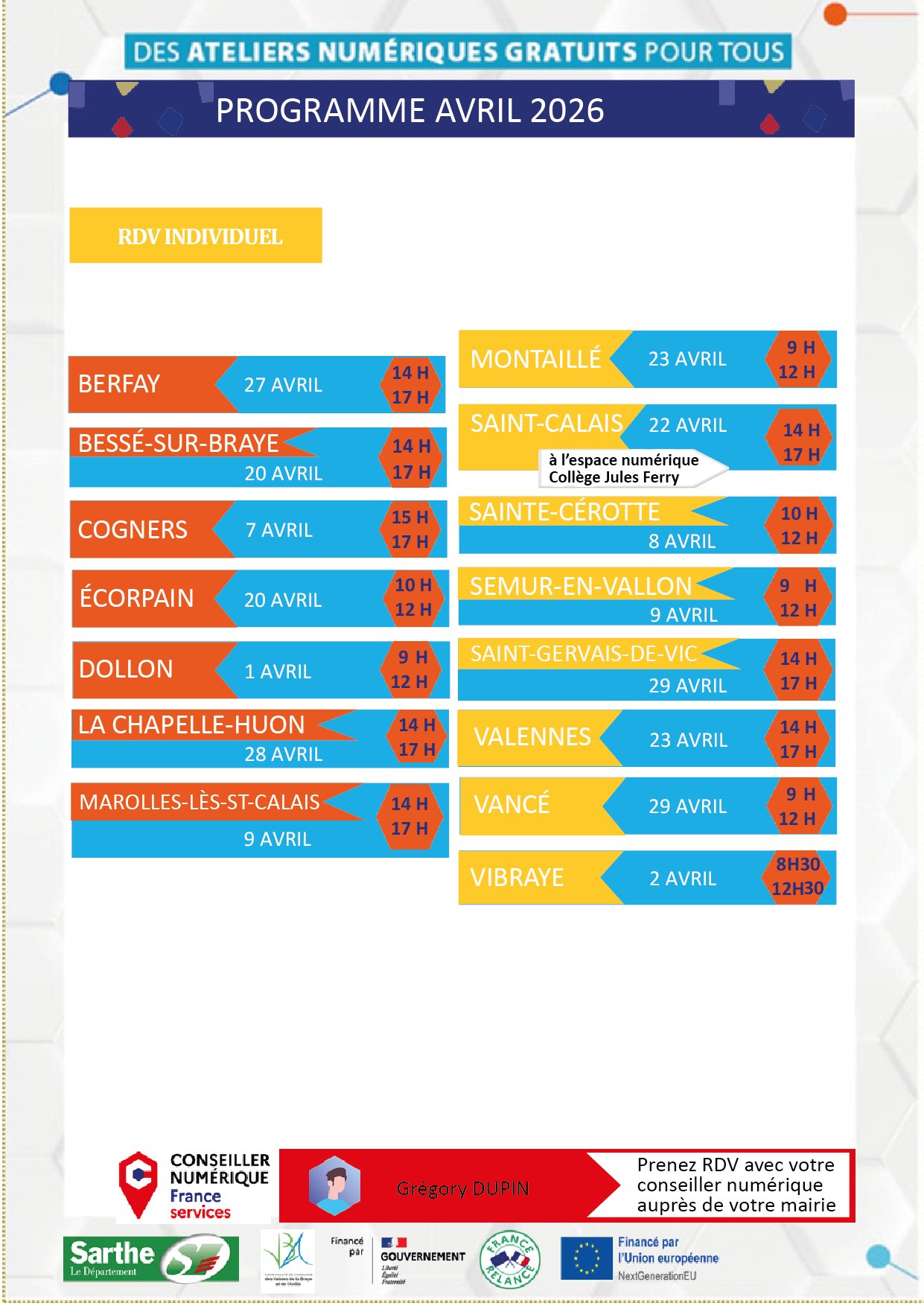 Le conseiller numérique sera présent sur notre commune le jeudi 9 avril 2026 de 9h à 12h.